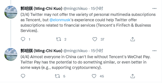 郭明錤认为,Twitter可能不会像腾讯那样提供多种多样的个人多媒体订阅服务,但其经验可以帮助Twitter提供与金融服务相关的订阅服务(比较腾讯的金融科技和商业服务)。在中国,几乎每个人都离不开腾讯的微信支付,Twitter Pay 有可能做类似的事情,甚至开展一些额外的业务例如支持加密货币等。
